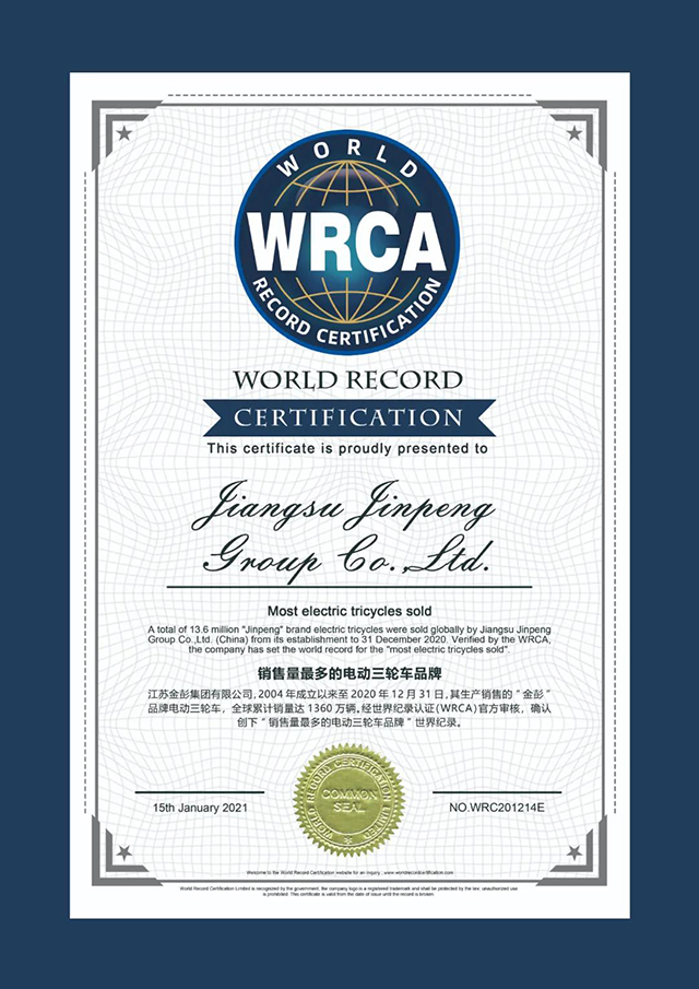 2021年5月10日,金彭集團再傳喜訊,金彭集團生產的電動正三輪摩托車產品,榮獲 “江蘇精品”認證證書,金彭集團是江蘇電動車行業唯一一家獲得“江蘇精品”認證殊榮的企業;打造“江蘇精品”是江蘇省委省政府實施創新驅動戰略、發展品牌經濟、推動經濟社會高質量發展的一項重要舉措。此認證是由江蘇精品國際認證聯盟,依據國際通行認證標準和流程,嚴格評選出的,定位于“國內先進、國際一流”,認證通過的產品和服務可以說是高質量的代名詞。此次金彭集團榮獲“江蘇精品”的認證,公司將以此為新的起點,繼續夯實基礎,強化管理,注重科技創新,嚴把產品質量,持續打造“江蘇精品”,續寫高質量發展新篇章。