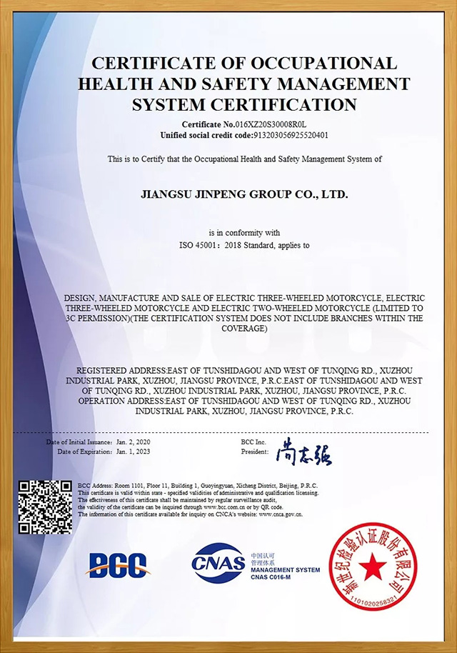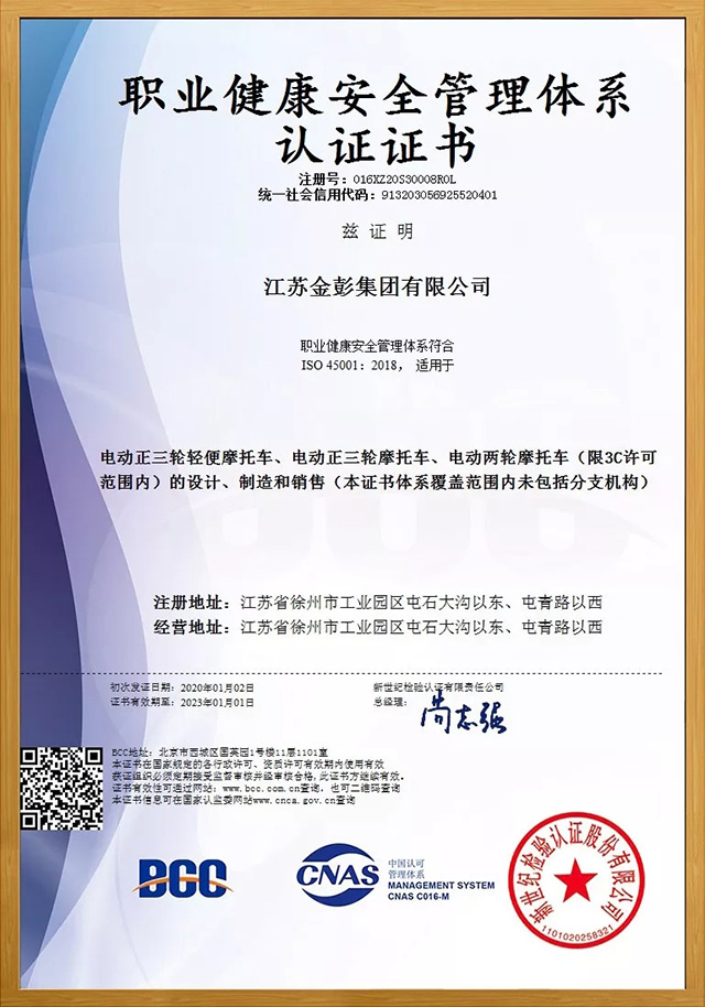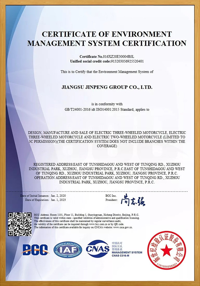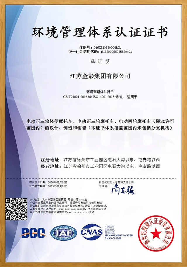 認證范圍:電動正三輪輕便摩托車、電動正三輪摩托車、電動兩輪摩托車(限3C許可范圍內(nèi))的設(shè)計、制造和銷售(本證書體系覆蓋范圍內(nèi)未包括分支機構(gòu))眾所周知,在國家不斷加大環(huán)保監(jiān)察力度的時期,此類認證的審查標準變得極為嚴苛。在評審后,還要通過環(huán)保監(jiān)察相關(guān)部門的核查后才能獲得認證。由此可見,上述兩份認證具有頗高的含金量,這也標志著金彭在各項管理工作和體系建設(shè)方面又上升到了新的水平,進一步實現(xiàn)了管理流程科學化、規(guī)范化、標準化;對集團持續(xù)改進管理理念、改善工作方法流程、構(gòu)建企業(yè)文化氛圍具有積極的推動作用;在對外部的各類合作、產(chǎn)品出口、品牌口碑等領(lǐng)域都更能彰顯出金彭的產(chǎn)業(yè)實力。