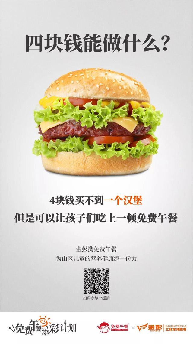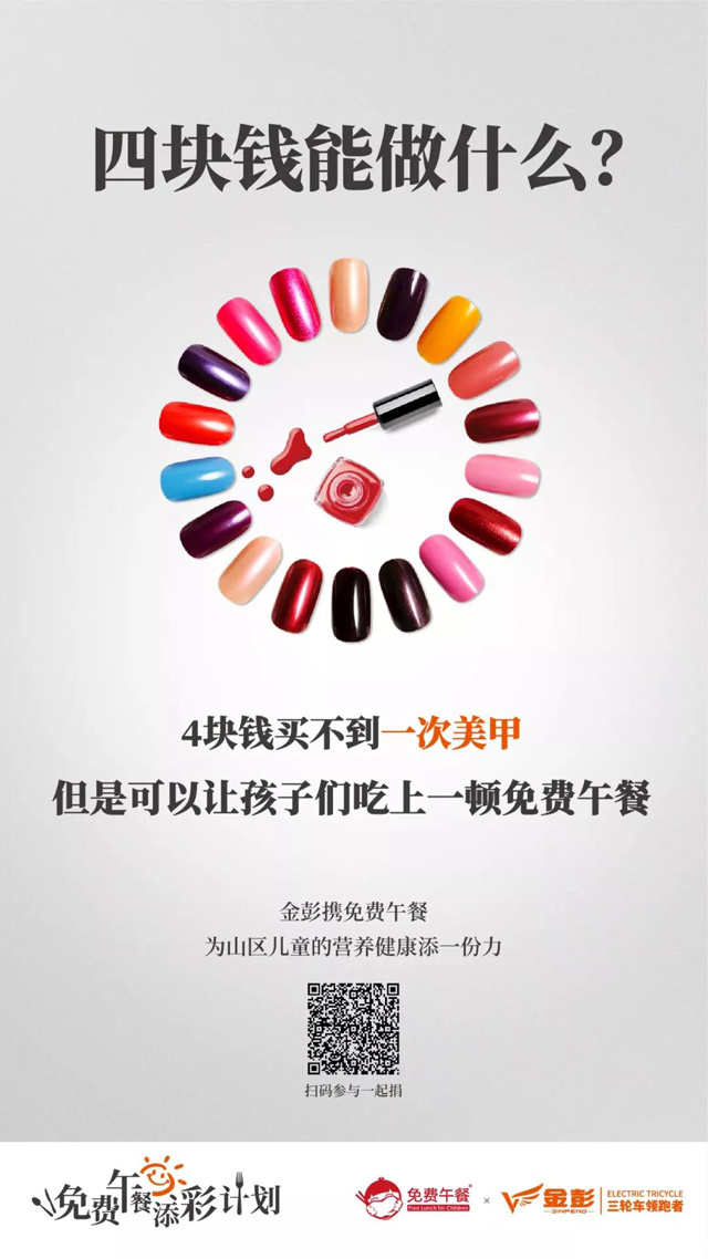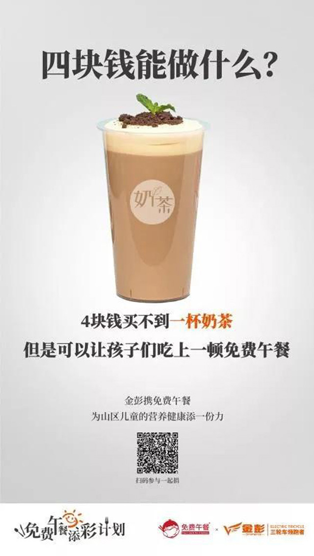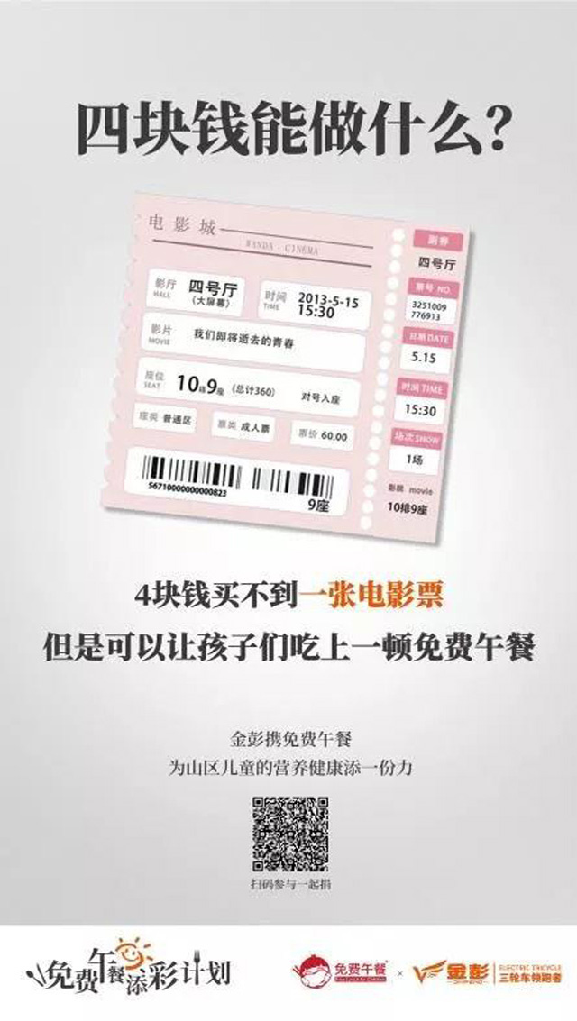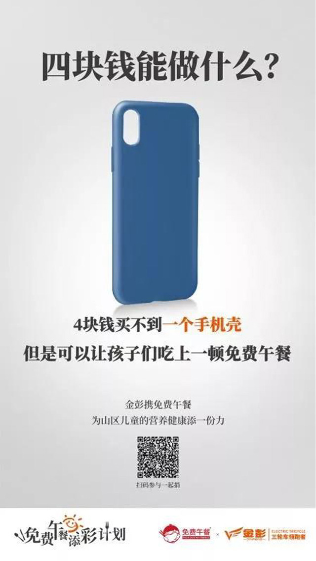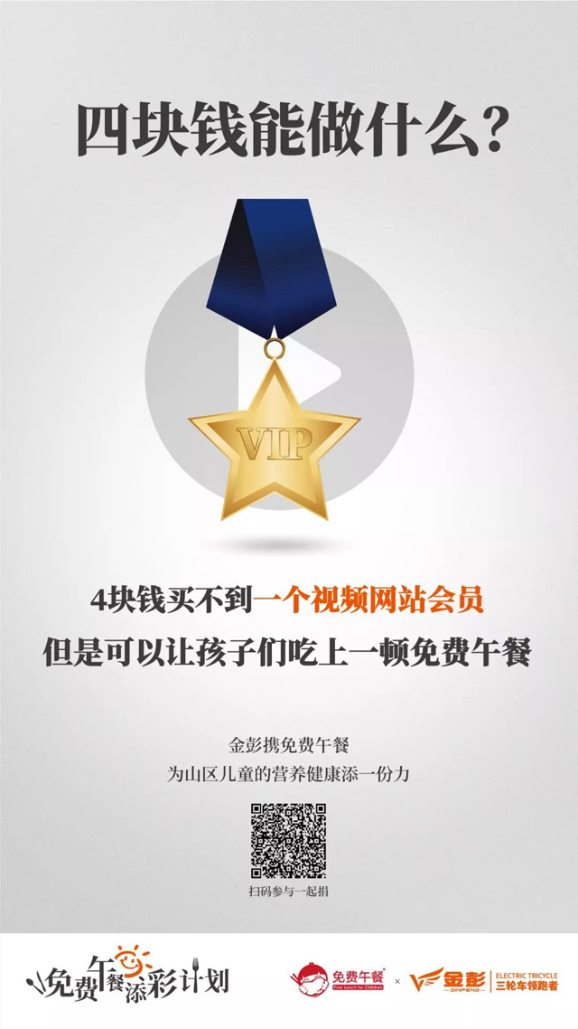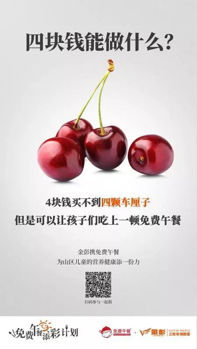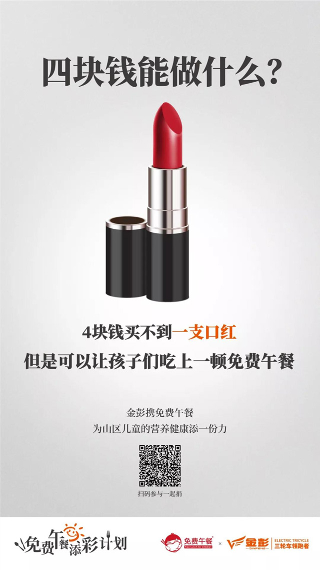 今年的6月1日,金彭將再次攜手免費(fèi)午餐,前往河南南陽臥龍區(qū)龍王溝風(fēng)景區(qū)陳家崗小學(xué),針對此次公益活動,金彭發(fā)起了添彩計(jì)劃支援者征集令。