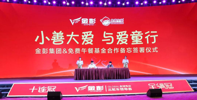 早在2018年1月舉行的年度盛典上,金彭與中國社會(huì)福利基金會(huì)免費(fèi)午餐基金簽署協(xié)議,達(dá)成長期戰(zhàn)略合作,金彭承諾自2018年起,每賣出一輛金彭電動(dòng)三輪車,就會(huì)向免費(fèi)午餐基金捐贈(zèng)一元錢,每年向免費(fèi)午餐基金捐贈(zèng)不少于100萬元用于幫助中國貧困地區(qū)留守兒童免于饑餓、健康成長,預(yù)計(jì)三年累計(jì)受惠學(xué)童75萬人次。