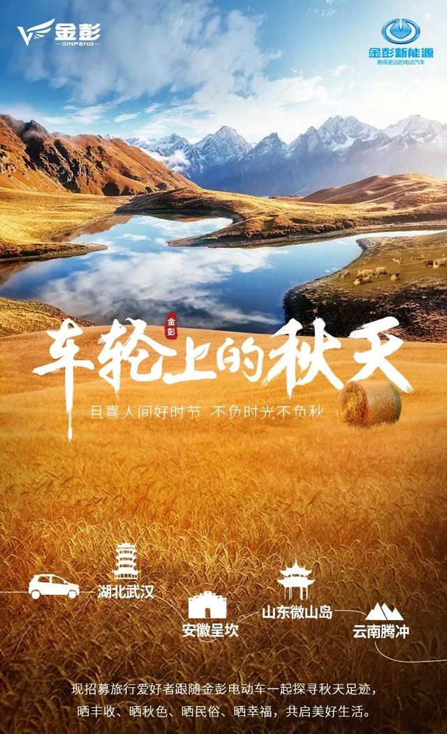 2018年,中國設(shè)立第一屆農(nóng)民豐收節(jié),為了向祖國致敬、向廣大農(nóng)民致敬,金彭策劃并啟動(dòng)了“車輪上的秋天”系列活動(dòng),在全國范圍內(nèi)挑選了五個(gè)各具特色的地點(diǎn),通過“秋忙會(huì)”、“曬秋”、“探秋”、“貼秋膘”、“品秋”五大主題,探訪武漢花博會(huì)、安徽古鎮(zhèn)呈坎、遼寧盤錦、山東微山、云南騰沖五地,代表全國人民深度體驗(yàn)不同的風(fēng)俗民情,領(lǐng)略風(fēng)格各異的秋收盛景。