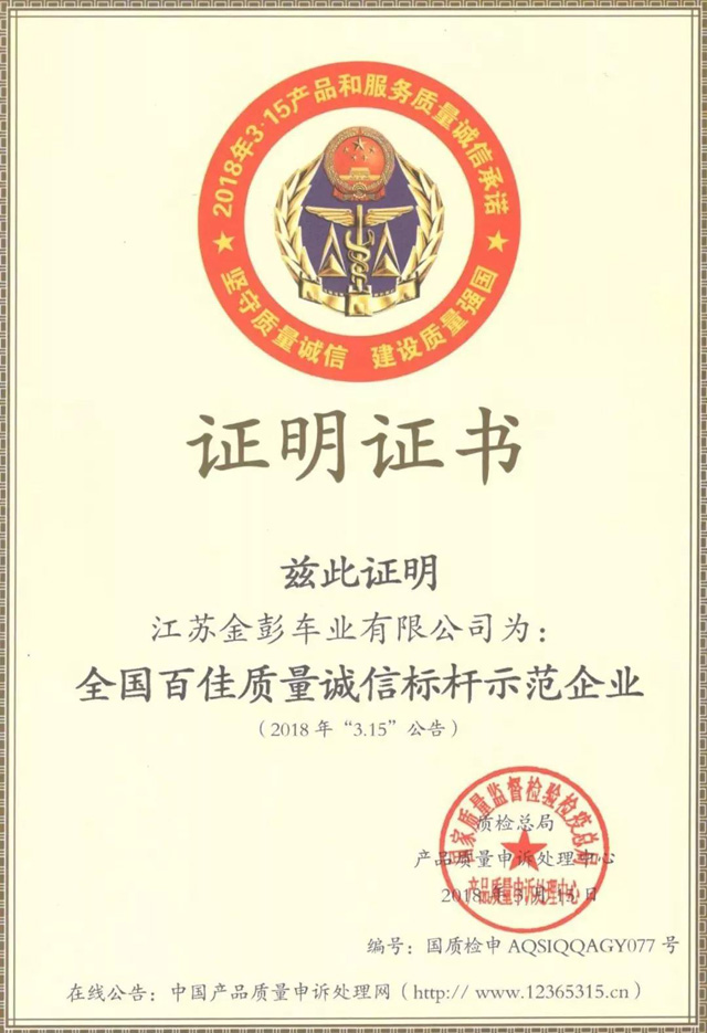 努力,讓自己更出色。2018年,金彭制造了太多大事件,雖談不上驚天動(dòng)地,但在業(yè)內(nèi)絕對(duì)稱得上首屈一指。付出,總會(huì)收到回報(bào)。2018年3月,金彭被國家質(zhì)量監(jiān)督檢驗(yàn)檢疫總局評(píng)選為“全國百佳質(zhì)量誠信標(biāo)桿示范企業(yè)”,同時(shí)獲得此項(xiàng)殊榮的還有華為、格力、海爾、聯(lián)想、小米等國民品牌。