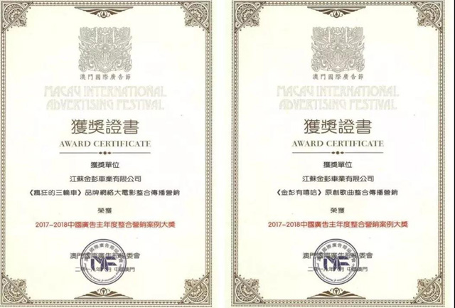 6月5日,金彭憑借原創(chuàng)歌曲《金彭有嘻哈》以及網(wǎng)絡(luò)大電影《瘋狂的三輪車》兩部作品一舉斬獲澳門廣告節(jié)“2017-2018年度中國廣告主年度整合營銷案例大獎(jiǎng)”。澳門廣告節(jié),一直被譽(yù)為“亞太地區(qū)傳播和營銷領(lǐng)域重要的風(fēng)向標(biāo)”,是亞太地區(qū)及兩岸三地廣告創(chuàng)意和營銷傳播卓越成果的試金石,年度大獎(jiǎng)在業(yè)內(nèi)具有極高的公信力和號(hào)召力。